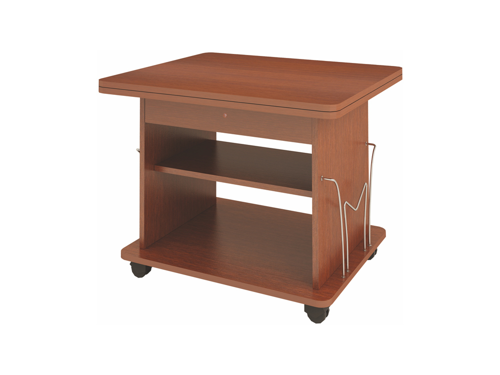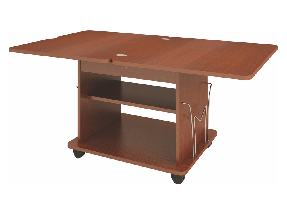 «Агат 14.2» – современный небольшой журнальный стол-трансформер. Поворотный механизм позволяет увеличивать поверхность стола в два раза. На нижней столешнице расположено радиусное углубление, выполняющее роль ручки. Внутри стола расположена полка для хранения скатерти и других полезных мелочей.