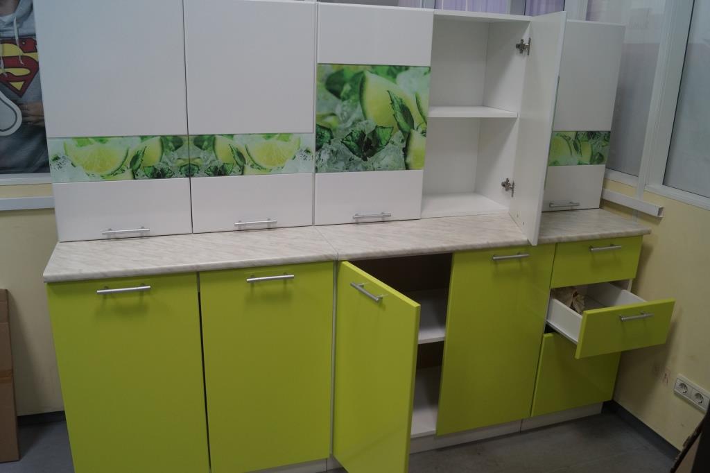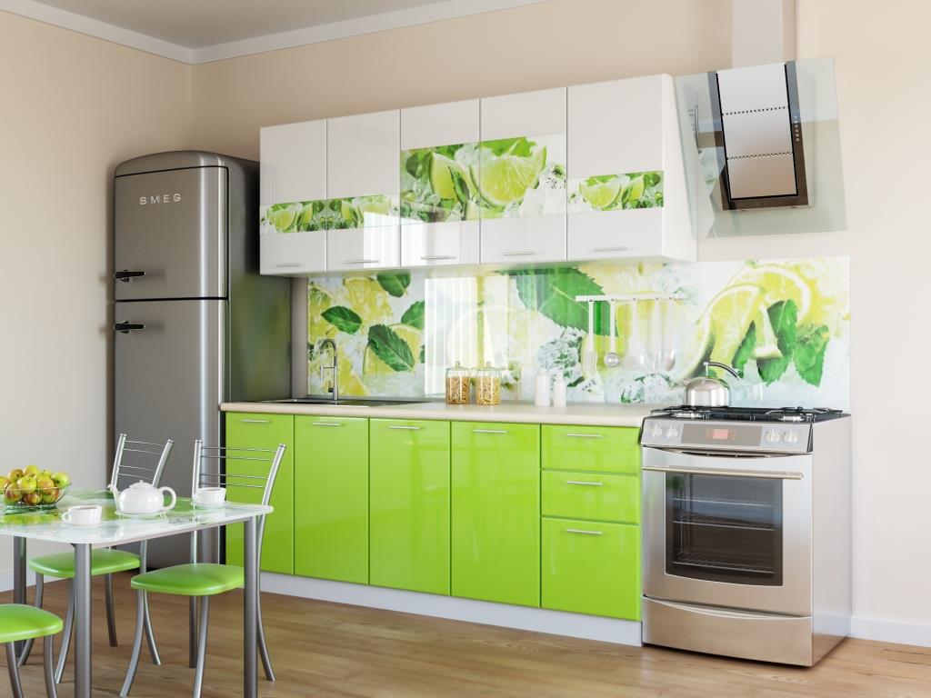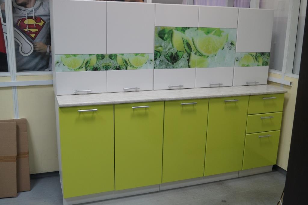 Цвет корпуса - ЛДСП белый Цвет фасадов - МДФ лайм/белый со вставками из стекла рисунок "Лайм" Цвет столешниц - постформинг мрамор светлый